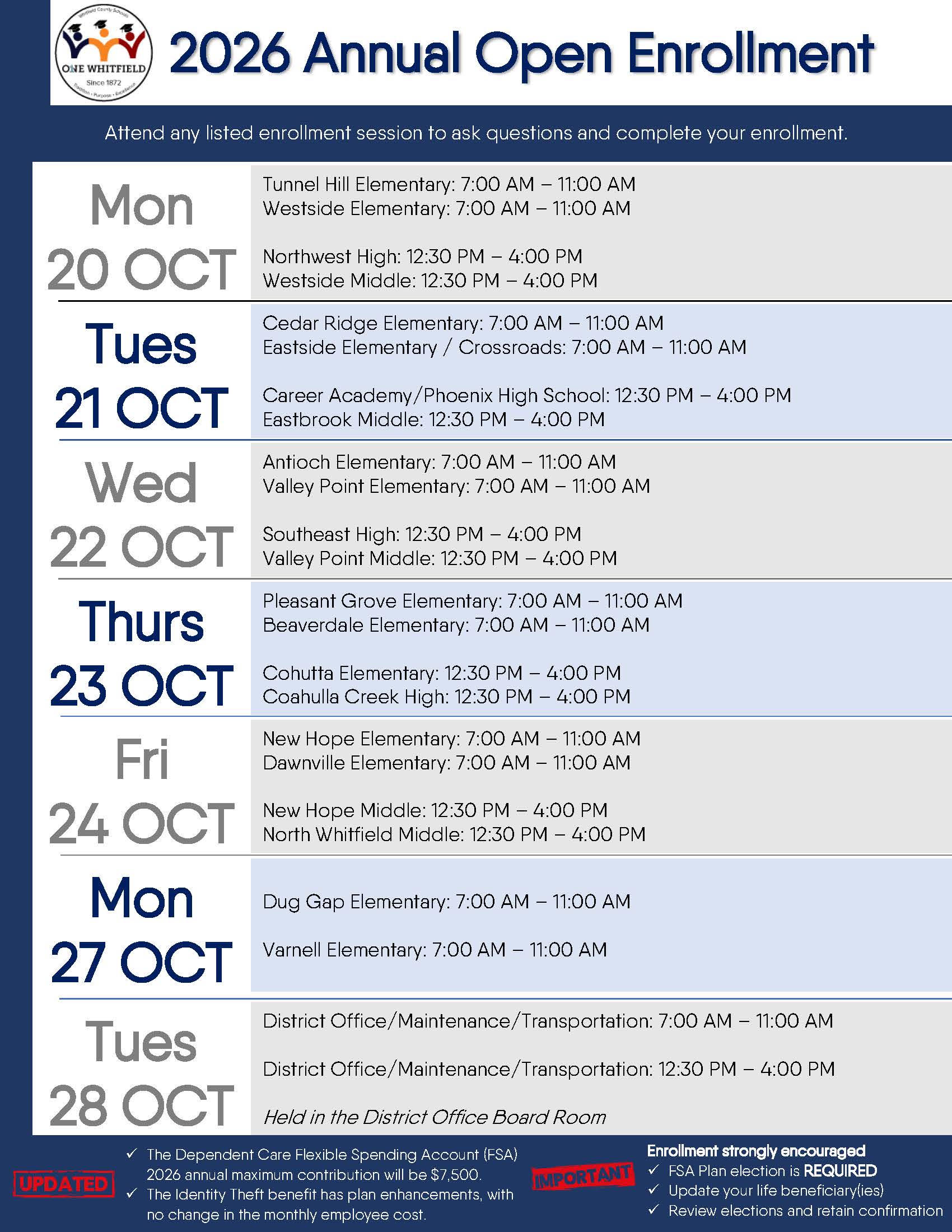 Benefit Representatives will be availabe to assist you with your 2026 benefits enrollment on the following dates and times: